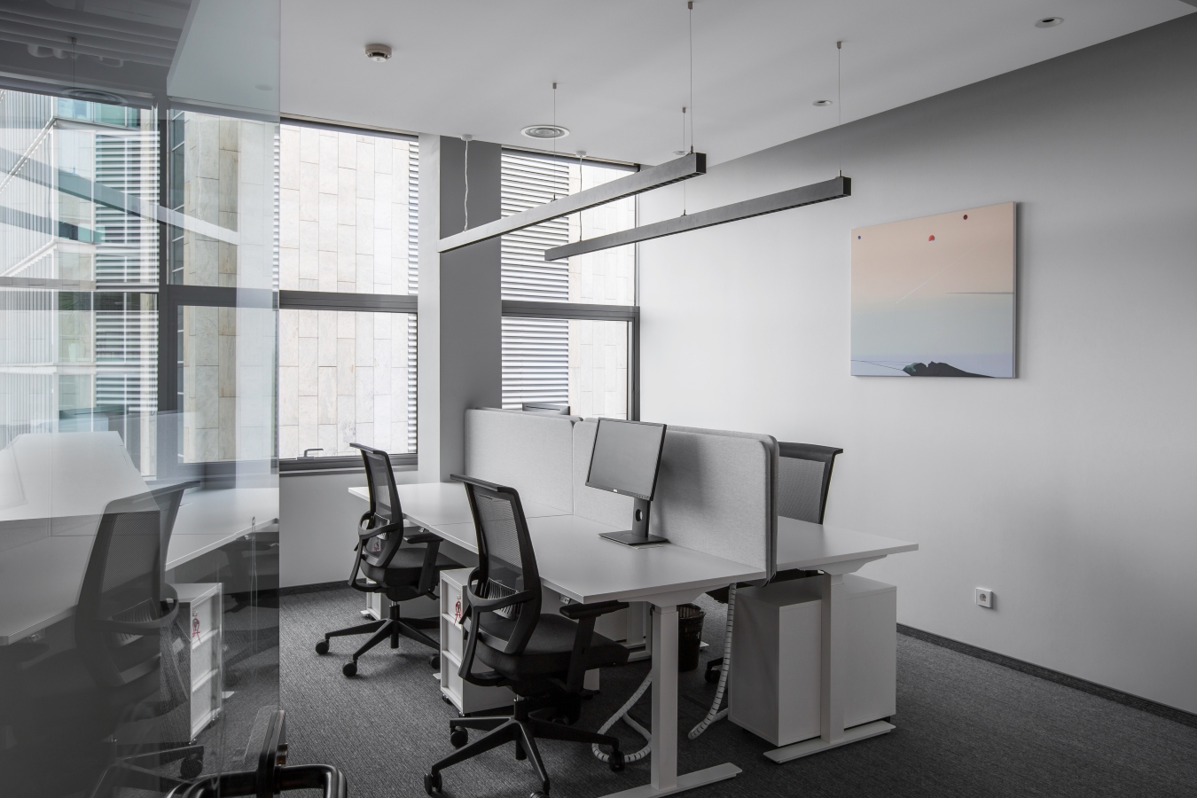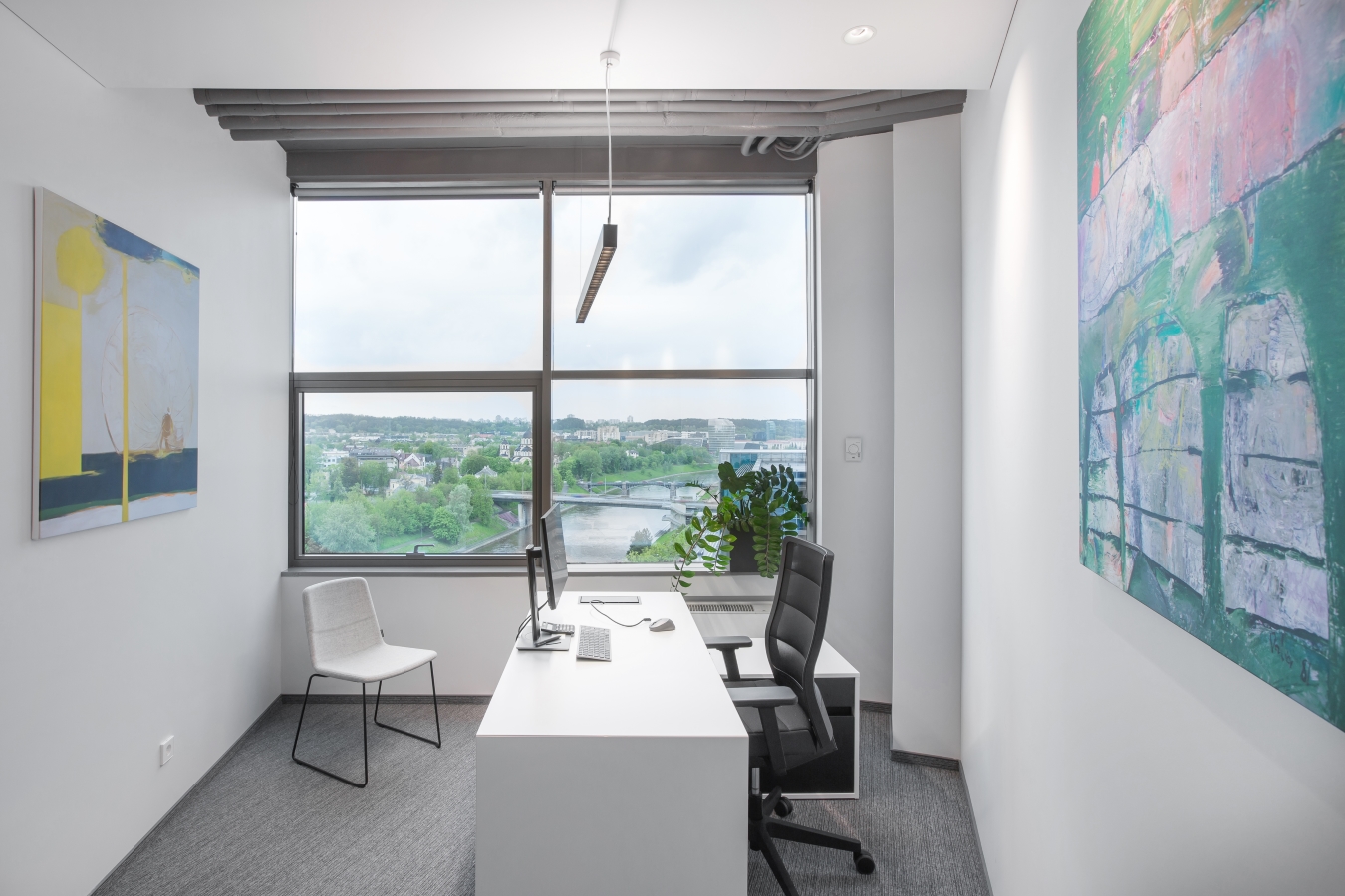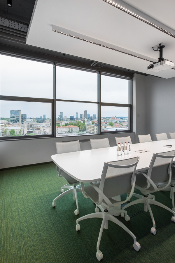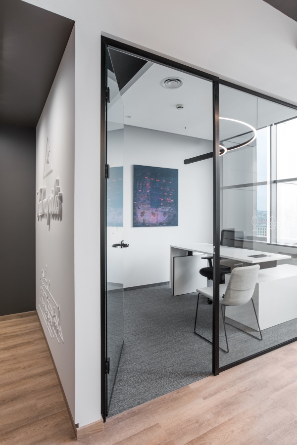 Konteksto prasme, šiame biure ypatinga atsiverianti miesto panorama per didelius ofiso langus. Norėjosi to neužgožti kuriant vidaus erdves. Tai inspiravo ir pagrindinius interjero sprendimus – monorchrominę spalvų gamą su santūriais lakoniškais įmonės identiteto akcentais. Dalis baldų tarsi susilieja su sienomis. Daug dėmesio skirta patogiam funkciniam kabinetų išplanavimui, atsisakyta spintų ir spintelių kabinetuose, juose dominuoja tik grakštūs lengvi ergonomiški stalai su įvairesnių formų kėdžių akcentais, o recepcija tarsi monumentali skulptūra kuria patikimos ir šiuolaikiškos kompanijos įvaizdį. Daug dėmesio skirta kokybiškam apšvietimui ir garsą suderiančioms dangoms.