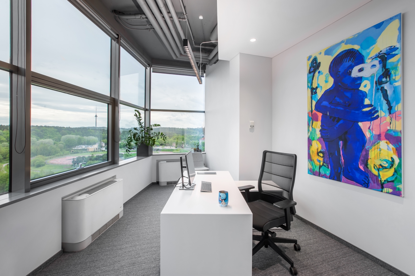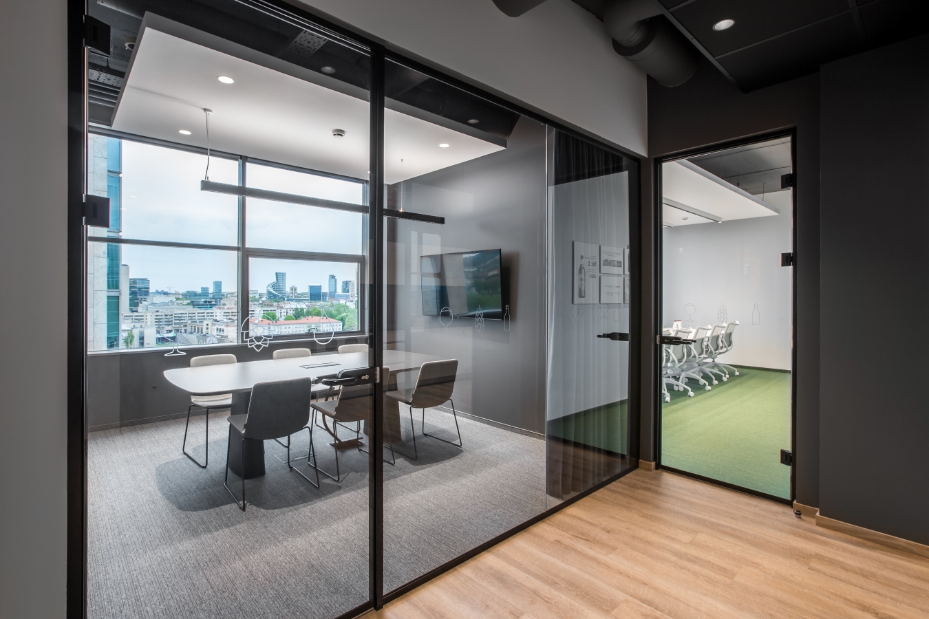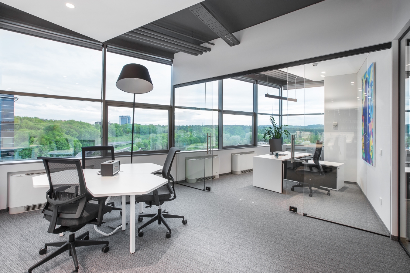 Konteksto prasme, šiame biure ypatinga atsiverianti miesto panorama per didelius ofiso langus. Norėjosi to neužgožti kuriant vidaus erdves. Tai inspiravo ir pagrindinius interjero sprendimus – monorchrominę spalvų gamą su santūriais lakoniškais įmonės identiteto akcentais. Dalis baldų tarsi susilieja su sienomis. Daug dėmesio skirta patogiam funkciniam kabinetų išplanavimui, atsisakyta spintų ir spintelių kabinetuose, juose dominuoja tik grakštūs lengvi ergonomiški stalai su įvairesnių formų kėdžių akcentais, o recepcija tarsi monumentali skulptūra kuria patikimos ir šiuolaikiškos kompanijos įvaizdį. Daug dėmesio skirta kokybiškam apšvietimui ir garsą suderiančioms dangoms.