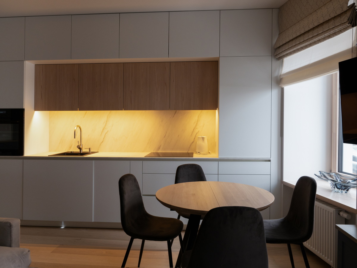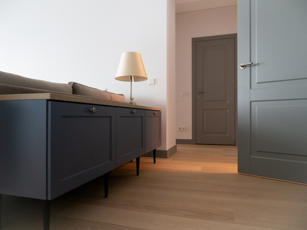 Laikantis interjero klasikinių tradicijų, prioritetai buvo nukreipti į gilią vidinę ramybę. Šis efektas pasiektas žaidžiant su spalva ir atspalviais. Kilni ir gili indigo spalva yra lyg kūrybingo požiūrio į gyvenimą užrašas. Indigo interjere skleidžia visuotinės ramybės ir dangaus aromato skonį. Šiame interjere šios spalvos yra saikingai, daugiausia dominuoja šilta balta ir pilkų atspalvių tonai, o medinės šviesinto ąžuolo grindys, bei baldų paviršiai viską suvienija savo šiltume, suteikiant jaukumo jausmą. Tinkamas erdvių zonavimas, baldų projektavimas ir spalvinis derinys suteikė butui daugiau funkcionalumo, elegancijos ir tapo šviesesnis. Pagrindinis buto akcentas patogus erdvių funkcionalumas ir švelnumas.