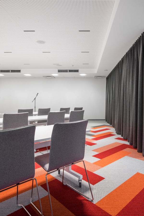 Projektuojant šios konferencijų salės interjerą buvo susidurta su trimis iššūkiais: pirmasis iššūkis – kaip išvengti beveidės, baltos erdvės, todėl pasirinkta spalvinga Desso Traverse kiliminė grindų danga; antrasis iššūkis – akustika, todėl