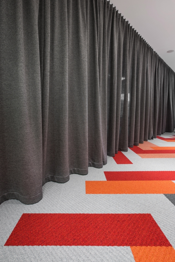 Kuriamam interjerui pasirinkta achromatinė pilkų atspalvių paletė ir oranžinės, rausvos ir raudonos spalvos. Logotipe užkoduota rodyklė buvo dinamiškai atkartota kuriant ir grindų projektą.