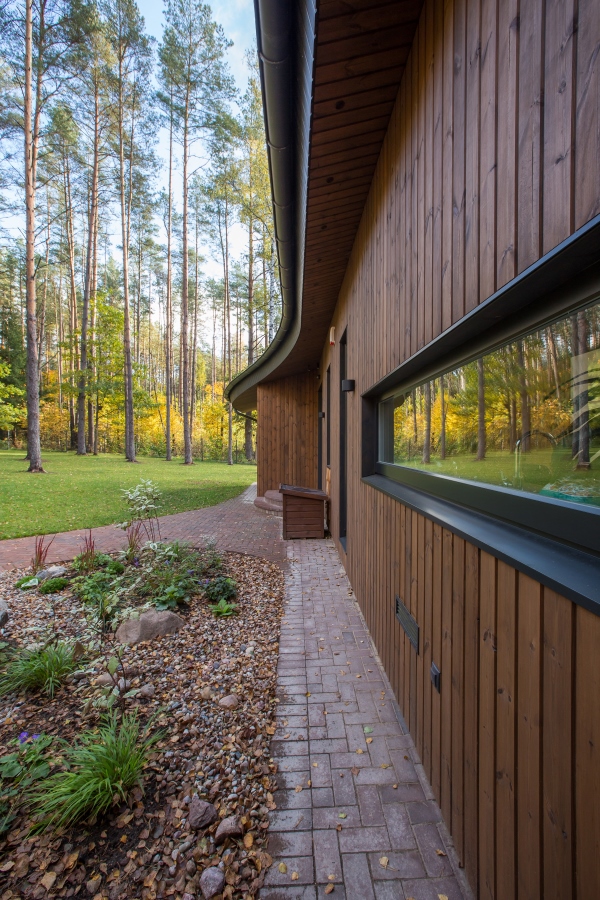 Natūralus namas – įsiliejantis į aplinką – mažas aukštingumas, tai nulėmė pagrindinį namo tūrį. Banguojanti stogo ir terasos linija atkartoja reljefo ir ežero vingius. Fasadų vertikalios maumedžio dailylentės iliuzija į medžius miške, o gontų intarpai tarsi pušų kamienų faktūra.