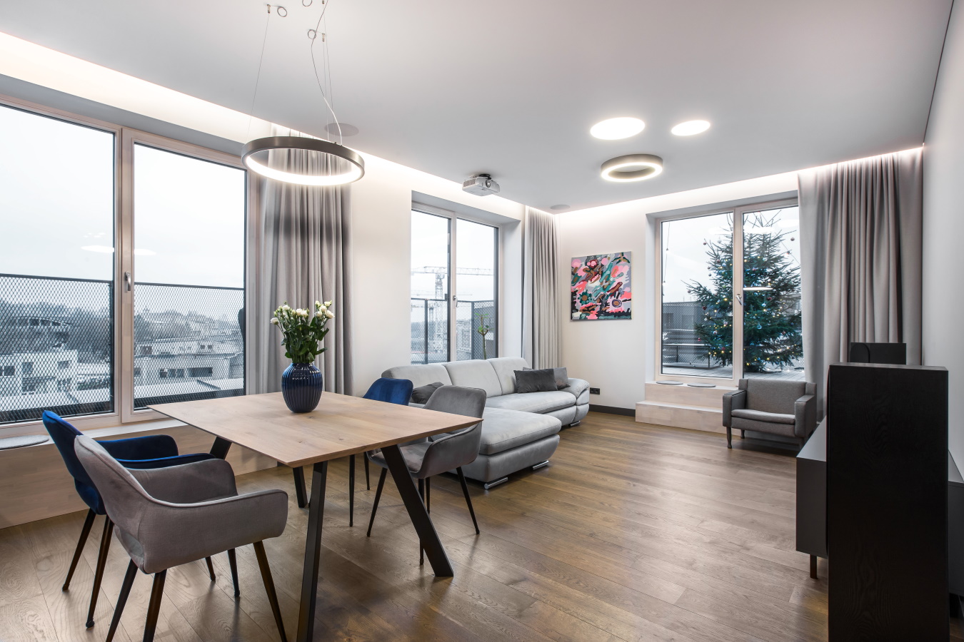 Viršutiniame Vilniaus daugiabučio aukšte esantis būstas užburia savo didžiuliu erdvės pojūčiu. Erdvios terasos, į senamiestį ir parką atsiveriantys vaizdai pro langus, skatina jaustis laisvai, nevaržomai, laimingai. Visa tai harmoningai pereina į interjerą. Jame atsikartoja dangaus, debesų, miško stilizuoti elementai – koridoriaus sienų apdailos vertikalūs tašeliai, dangaus kolorito akcentai, apvalūs šviestuvai. Protingos būsto sistemos atspindi šeimininkų šiuolaikišką požiūrį ir skatina energingą gyvenimo būdą. Jomis valdomas šildymas, apšvietimas, klimato kontrolė, užuolaidos, audio video sistema visame bute – užsakovas gali sukurti asmenines visumines scenas integruojant visus tuos elementus.