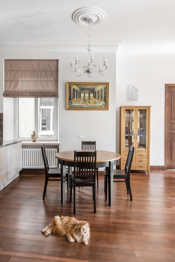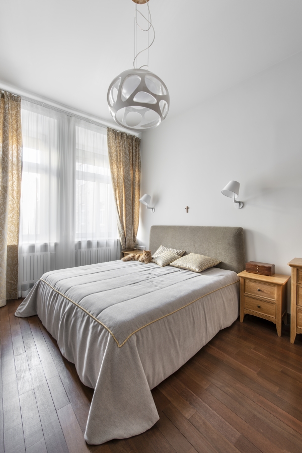 Istorizmo epochos name siekta išsaugoti laiko tęstinumo jausmą. Taip atsirado autentiškų plytų atodanga sienoje, įvairių laikmečių šeimininkų baldai ir interjero elementai, juos papildė naujai suprojektuotas holas, virtuvė ir vonia. Virtuvės išdėstymą ribojo pastato inžinerijos ir konstrukciniai sprendimai, bet plautuvę ir indaplovę įgilinus sienoje, pavyko suformuoti patogią „judėjimo trikampiu“ schemą. Virtuvė su valgomuoju tapo svarbiu bendro kambario traukos centru, kur „verda“ šeimos gyvenimas, o knygų lentynomis atskirta – ramesnė darbo zona. Klasikinių proporcijų svetainės langai dekoruoti aukštomis rausvo aukso spalvos užuolaidomis, kurios ne tik žaismingai atspindi šviesą, bet ir sukuria saulėtos dienos įspūdį net ir apniukusiu metu. Interjere santūri elegancija kurta naudojant klasikines medžiagas – raudonmedžio grindys ir paaukštintos durys, įvairių rūšių mediena ir neiššaukiančios detalės.
