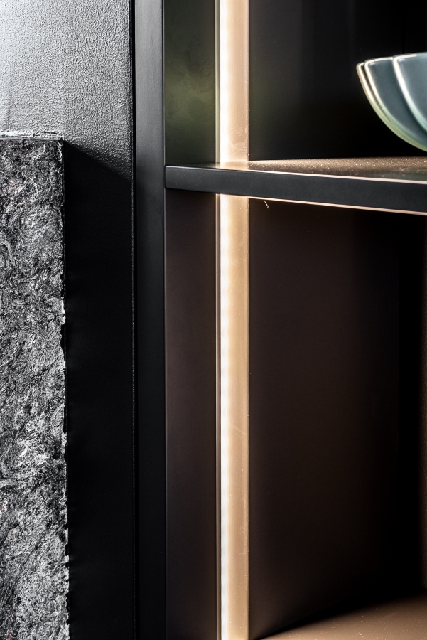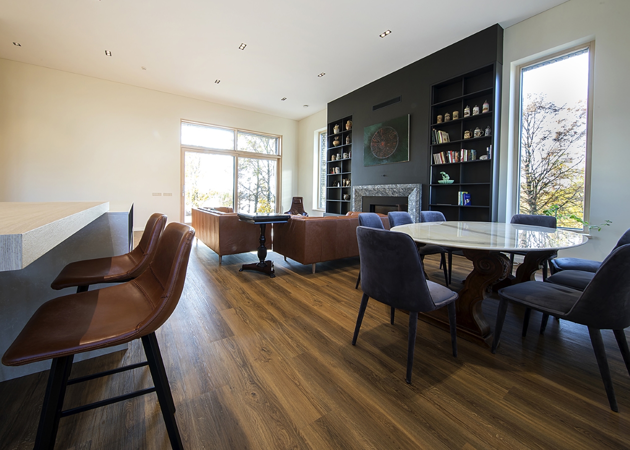 Interjeras kurtas kartu su pastato architekte Jūrate Norkute, atsižvelgiant į užsakovų gyvenimo būdą ir pomėgius. Pagrindiniai pageidavimai buvo – didelis židinys gyvenamosios erdvės centre, erdvi patogi virtuvė, daug langų į atsiveriančią gamtą, bei neutralus jaukus stilius, kurime galėtų atsirasti šeiminimkų taip mėgstami antikvariniai elementai.